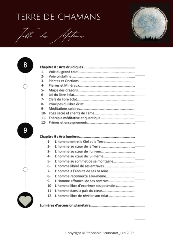 "Ce livre vous invite à vous éveiller à la voie chamanique du coeur de votre être véritable, à réveiller le sage guérisseur qui est en vous afin que vous puissiez activer vos potentiels de guérison intérieure, vos arts médiumniques, chamaniques, druidiques et quantiques dans le but de soigner les blessures originelles de votre âme. Ce livre offre à l’humanité une nouvelle Terre de lumière au sein delaquelle elle pourra venir se ressourcer et se réaligner à sa raison d'être afin d'avancer justement vers la réalisation de ses rêves profonds. Le Ciel et la Terre n’auront plus de secret pour vous car ce livre vous transmet les arts sacrés de guérison des peuples ancestraux, la magie des esprits guides de la nature et la sagesse des mondes environnants qui s’opposent à votre involution planétaire et qui vous accueillent aux portes de votre univers intérieur pour vous éveiller à la dimension sacrée de votre cœur où siège la conscience cristalline de l'amour divin. J’apporte à cet enseignement de lumière toute la rayonnance sacrée des mondes environnants qui veillent sur votre univers intérieur afin de vous apporter le meilleur d’eux-mêmes pour la réalisation de votre mission de vie sur Terre."
